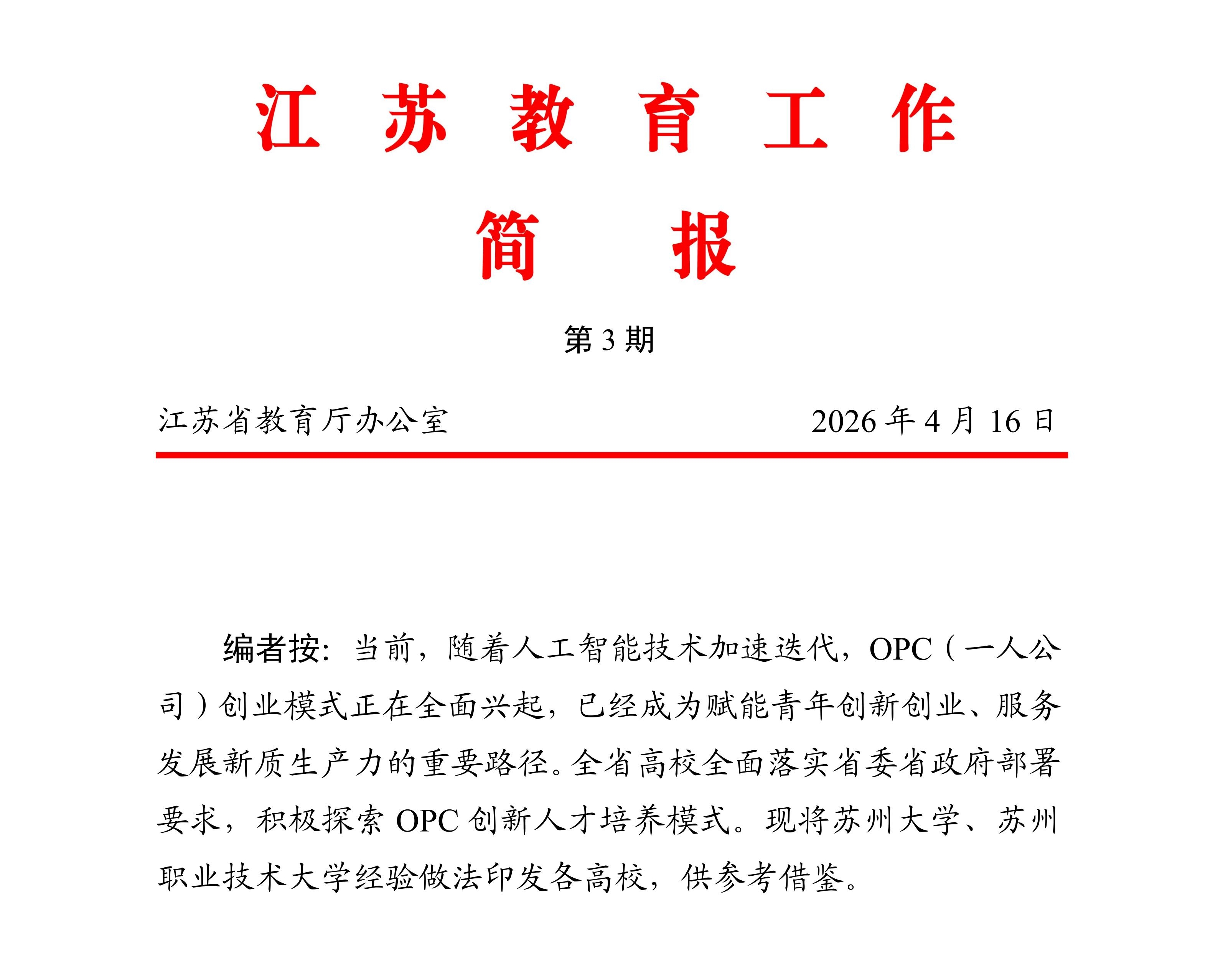 《江苏教育工作简报》报道我校OPC创新人才培养经验做法