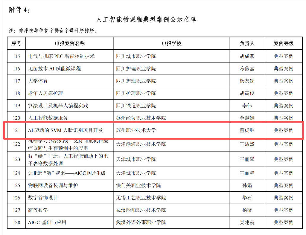 另一项《AI驱动的SVM人脸识别项目开发》入选人工智能微课程典型案例。该课程以人脸识别真实项目为载体,将AI技术全流程融入教学,降低实践门槛,实现个性化辅导,为职业院校AI微课程建设提供了创新示范。