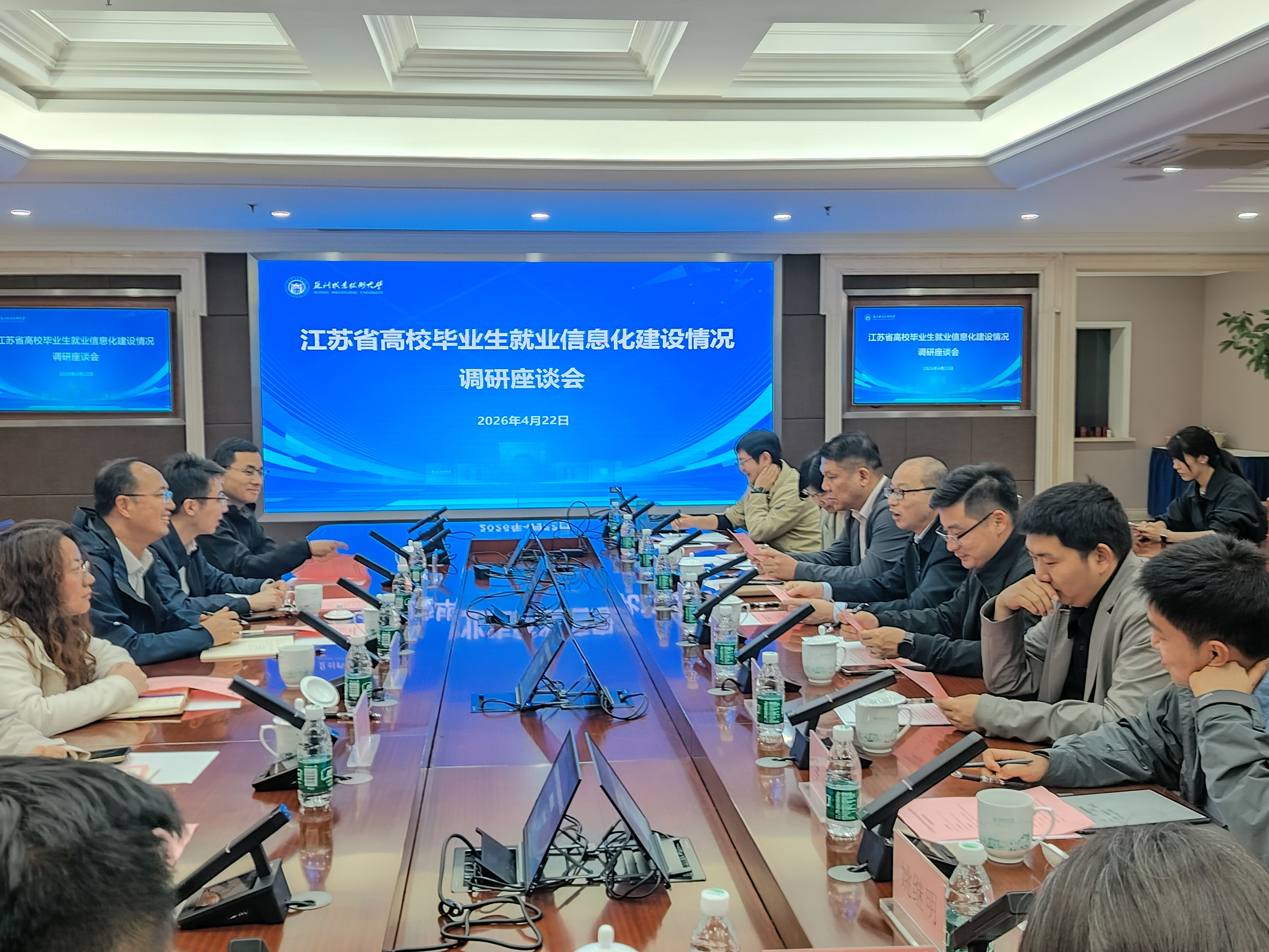 4月22日下午,江苏省高校毕业生就业信息化建设情况调研座谈会在我校召开。江苏省高校招生就业指导服务中心信息服务部部长王磊、主管吴劼一行5人来校,就“AI+就业”信息化建设开展专项调研。我校副校长张军出席并致辞,学生工作处处长张国良作专题汇报。苏州工艺美术职业技术学院、苏州经贸职业技术学院、苏州卫生职业技术学院、苏州工业职业技术学院等高校参会交流。