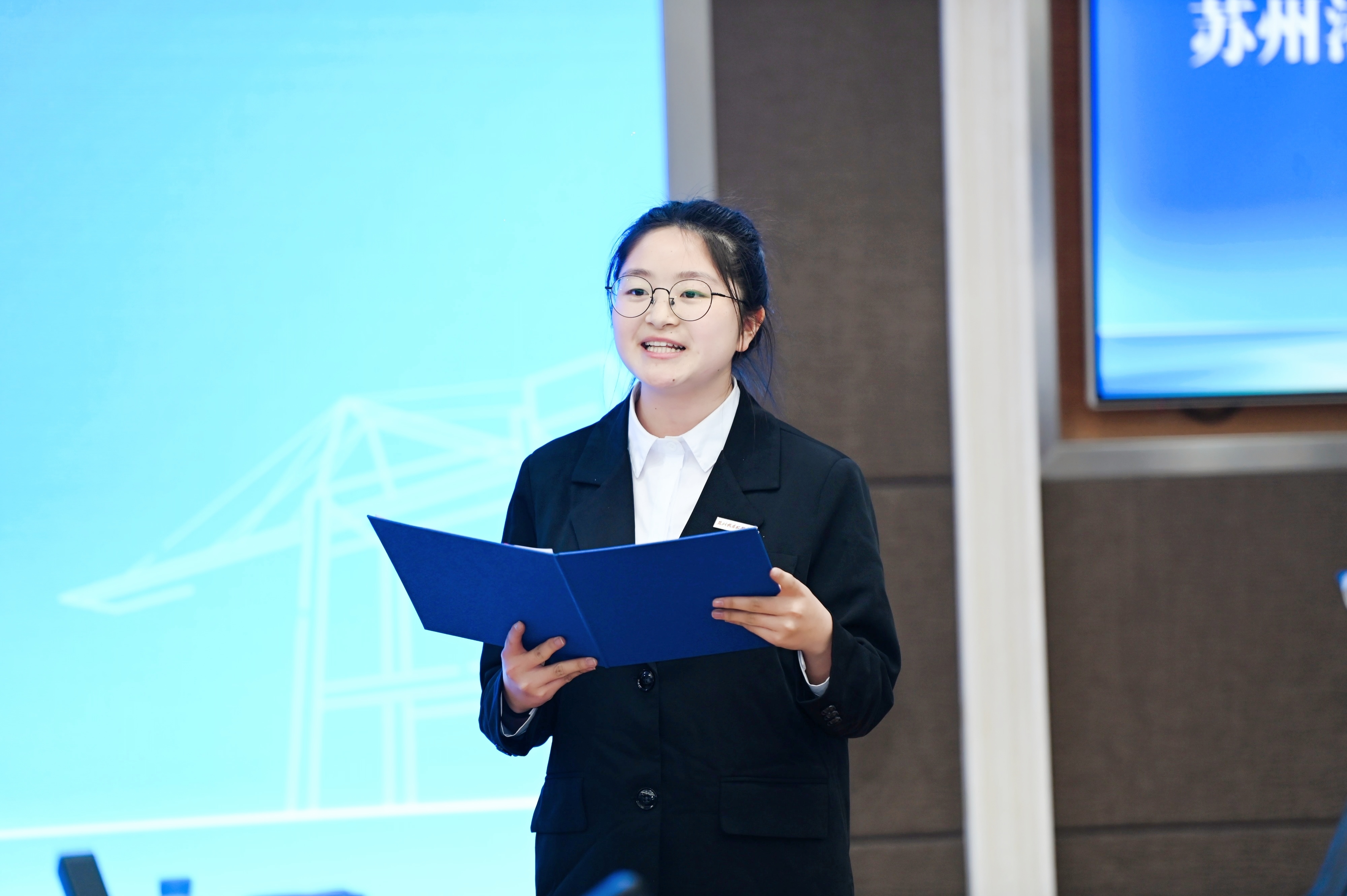 24现代物流管理1班陈莘羽同学作为订单班学生代表发言。她回忆起去年秋天在太仓港参观时的触动:“巨轮、桥吊、一望无际的集装箱,让课本上的概念变成了真实场景。”如今,AI单据智服中心正式启动,她激动地说:“我们不再是观望者,而是真实业务的参与者。”她代表全体订单班同学郑重承诺:珍惜机遇、严守规矩、不负所托,用扎实技能为智慧港口贡献青春力量。